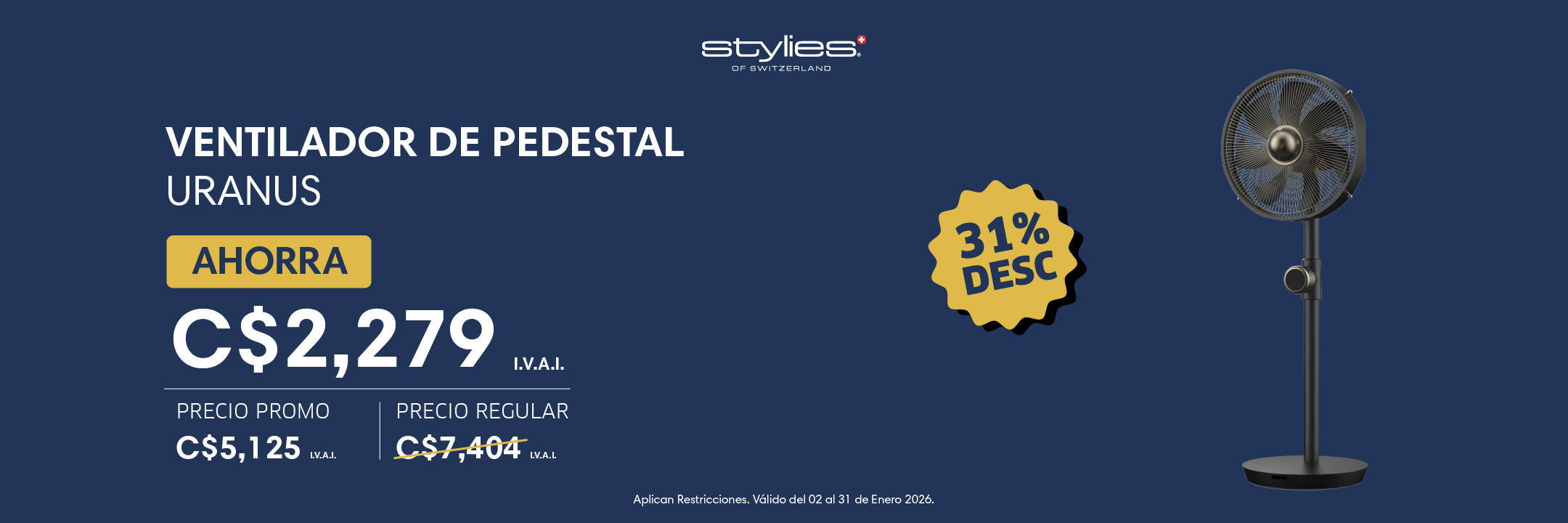 Ventilador premium de pedestal ultra silencioso marca Stylies modelo UranusStylies